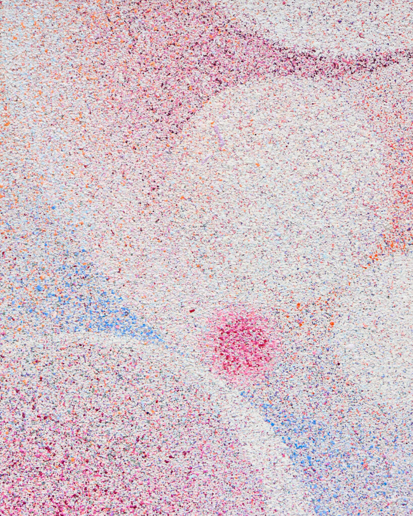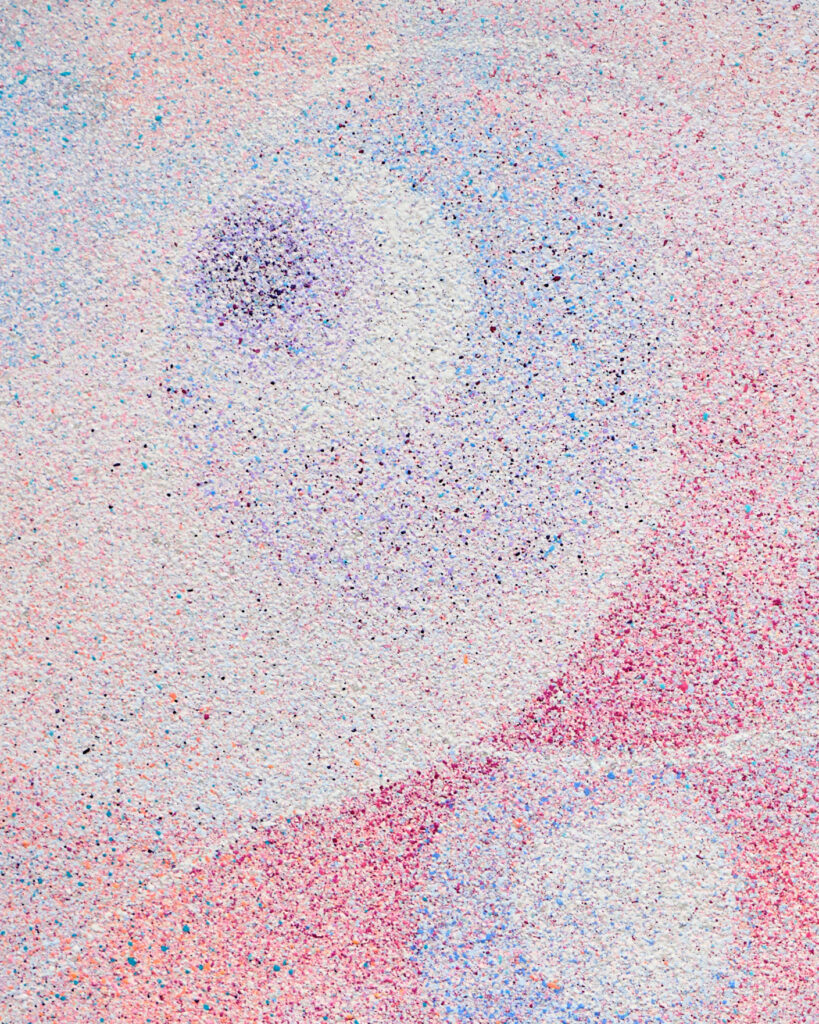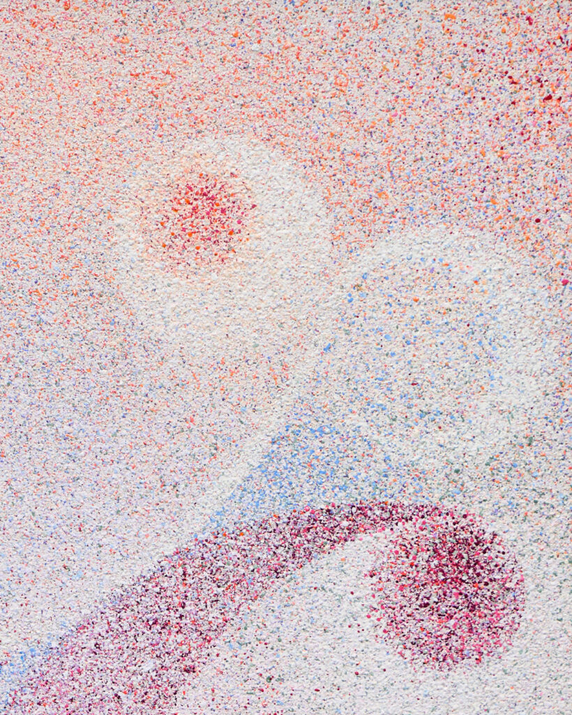 The expanding curvilinear structures and the scattering of particles open the pictorial field outward. Color and form take shape through the interplay of air, light, and the viewer’s gaze. The roughly accumulated surface draw the painting, the surrounding atmosphere, and the viewer’s body into a single tactile space. In this way, painting functions not as a completed image but as a condition and environment in which sensation and perception are continuously reconfigured and transmitted.