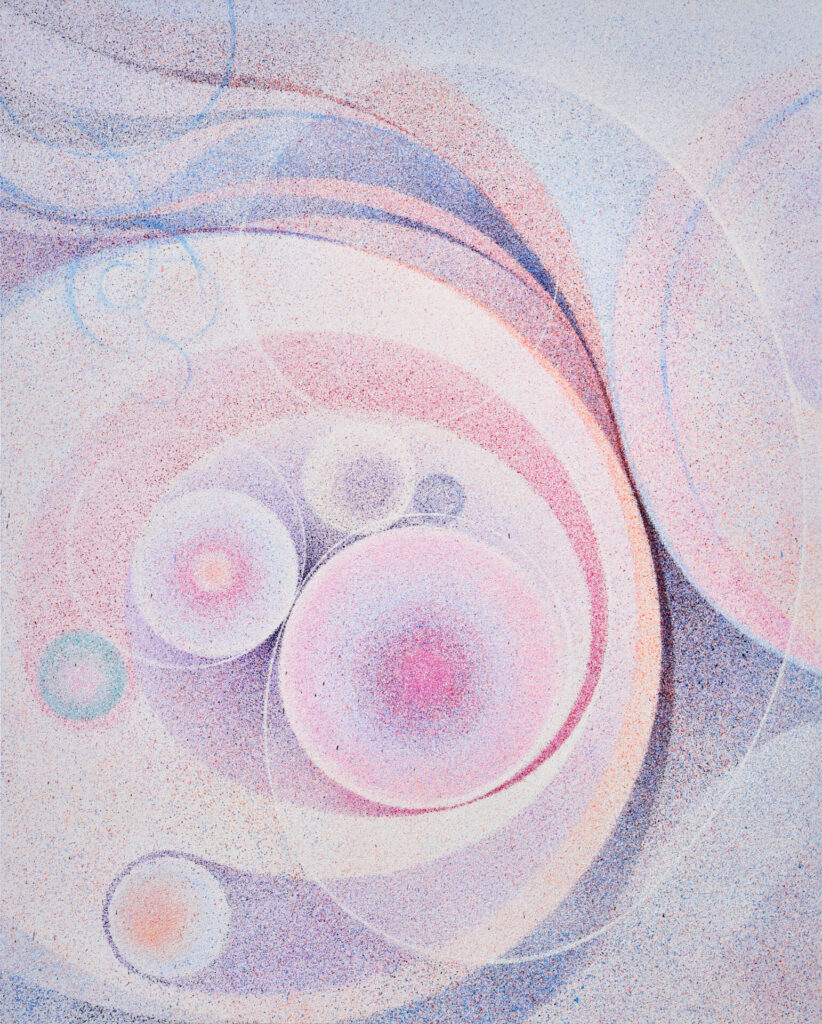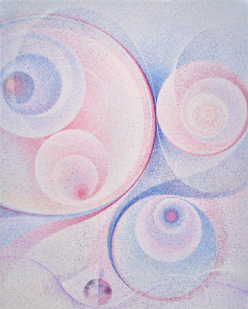 The Sprayed Orbits series is produced by connecting tangent circles that meet at a single point to generate curves, and by spraying paint to inscribe their trajectories onto the canvas. As geometric points of contact unfold, the center of the circle shifts, transforming circular motion into a dual-directional movement through which interior and exterior permeate one another. Rather than brushwork, the spraying process erases the trace of the hand and reveals the autonomous movement of paint particles that disperse, gather, and gradually change in color.